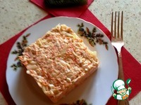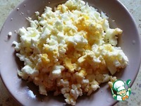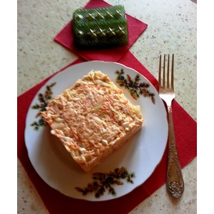 Смешать все ингредиенты, заправить майонезом по вкусу. Из указанного количества продуктов получается два плотно утрамбованных квадрата размером 10Х10 см, высотой 4 см. |