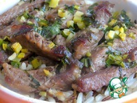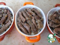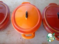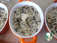 5. В форму поверх черемши укладываем рис, затем утапливаем в нем кусочек сливочного масла, затем на рис мясо и присыпаем отложенной черемшой. Поверх всего кладем ложку сметаны. Накрываем крышкой и отправляем в разогретую до 180С духовку на 10 минут. Достаем и подаем!!! |