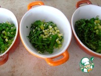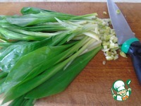 3. Черемшу нарезаем. Форму обильно смазываем оливковым маслом, даже слегка наливаем на дно, выкладываем нарезанную черемшу, но не всю, 2/3 от всей. Остальную оставляем она нам пригодится позже.