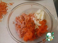 В фарш добавить мелко нарезаную маленькую луковицу, одну морковку натертую на мелкой терке. |