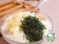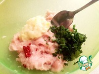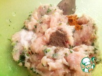 Делаем начинку. Кинзу, петрушку, чили, лук и чеснок мелко измельчить. В миске смешать куриный фарш и зелень... |