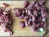 Куриные сердечки промываем, срезаем с них излишки жира и оставшиеся сосуды. |