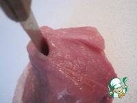Мясо (у меня нежирная свинина) прорезаем в длину пока нож не выйдет с другой стороны. |
