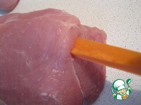 Описание: Мы очень любим мясо, но весной хочется легкого, нежирного и сочного кусочка. Этого можно добиться нашпиговав кусок мяса овощами. Мясо выглядит очень красиво и необычно, поэтому его можно приготовить для приема гостей. Шпигование морковью и чесноком позволяет получить очень интересный и оригинальный ансамбль вкусов и свойств, который можно есть как в горячем так и в холодном виде. Благодаря шпигованию мясо практически тает во рту, становиться сочным, ароматным и менее калорийным.