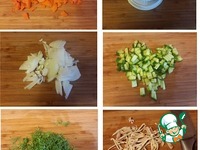 Нарезать отварную морковь, яйца, лук (ошпарить его кипятком), свежий огурец, укроп и отварные кальмары |