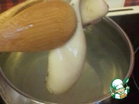 Кальмары очистить от пленки, внутренностей и хитинового скелета, отварить в подсоленной воде 5 минут, остудить |