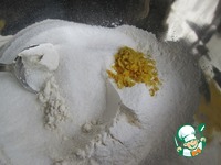 Теперь займёмся тестом. Для этого надо смешать сахар, цедру и просеянную муку с разрыхлителем. |