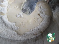Отделить белки от желтков, перемешать желтки с молоком и сливочным маслом и добавить к сахарно- мучной смеси. |