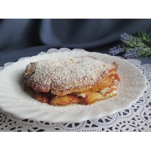 Теперь надо разложить по 4-м блинам сыр рикотта и сверху выложить дольки груш. Накрыть другим блином и сверху посыпать сахарной пудрой. |