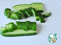 Далее каждую полоску огурца режем наискосок кусочками длиной около 1 см. |