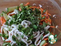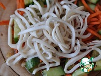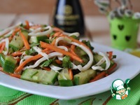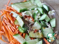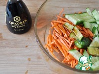 Смешиваем огурец и морковь, добавляем соль, уксус и соевый соус "Киккоман". |