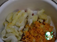 Добавляем в кастрюльку обжаренный лук с морковкой, нарезанные кабачки |