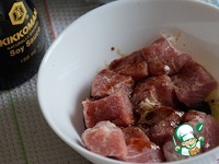Мясо замариновать в смеси оливкового (растительного) масла и соевого соуса. Даль полежать минут 30. Можно больше. |
