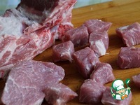 Мясо нарезаем маленькими кубиками - размером с крупный орех фундук. Мясо я взяла свинину - антрекот. |
