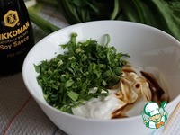 В миске смешиваем нарезанную черемшу, сметану и соевый соус. Попробуйте на вкус - если не солено - добавьте еще соевый соус. У меня ушло ровно 2 ст. л. соевого соуса. |
