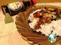Добавить зелёный горошек не размораживая. Готовить всё вместе ещё 4 минуты помешивая. Посыпать сахарным песком, готовить помешивая ещё 1 минуту. Влить соевый соус. Перемешать. Прогреть. |