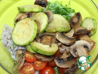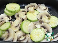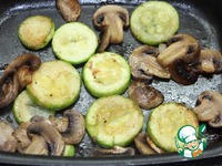 Кабачок и грибы выложить в огнеупорное блюдо, сбрызнуть 1 ст. л. оливкового масла, приправить солью и перцем, и запечь в разогретой до 180 градусов духовке до румяности, перевернув один раз. |