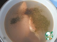 Лосось (в моем случае хребты) заливаем водой (я заливаю горячей). Добавляем хмели-сунели, соль, перец, базилик верим 10 минут с момента закипания. |