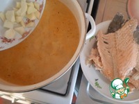 Достаем рыбу, а в получившийся рыбный бульон, вводим мелко порезанный картофель. |