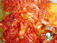Добавить томатную пасту и спассеровать ее с сахаром до окрашивания масла в красный цвет. |