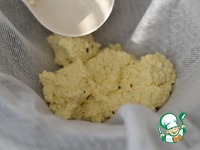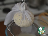 Даем полностью стечь жидкости. Завязываем марлю туго и подвешиваем сыр, минимально на 8 часов. Я оставляю на ночь. Утром сыр завернуть в пищевую пленку и в холодильник. Подавать с хреном. |