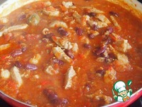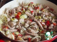 На сковороде разогреть масло, обжарить мясо, постоянно перемешивая, чтобы оно "схватилось" со всех сторон. Добавить порей, болгарский перец и перец чили, перемешать. |