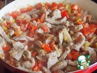 Сковороду накрыть крышкой, тушить минут 5. Затем добавить томатную пасту, немного воды, посолить и поперчить мясо. Тушить 10-15 минут. |