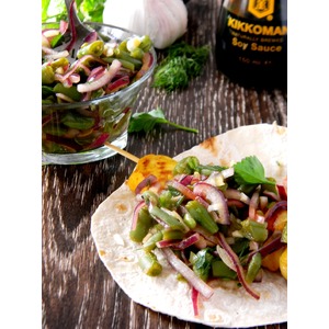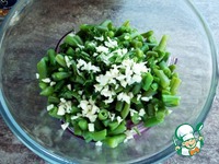 Соединить в миске фасоль, лук, чеснок и зелень. |