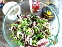Для заправки в отдельной емкости смешать масло, соевый соус, мед и острый соус. |