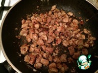 3 маленькие луковицы измельчил в блендере и добавляем к мясу, минуты-полторы обжариваем вместе с мясом. |