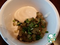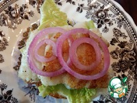 Сверху положить кусочек рыбы и репчатый лук. |