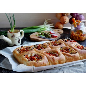 Сверху выложить нарезанные оливки и маринованные опята. Сбрызнуть 1 ст л подсолнечного масла"Олейна" и выпекать при 200 гр мин 20-25. |