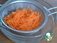 Морковь почистить и натереть на терке для корейской морковки. Залить морковь горячей водой на 15 минут. Откинуть на дуршлаг. |