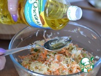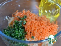 Морковь посолить и хорошенько помять рукой. Пеперчить и перемешать. Добавить к моркови квашенную капусту и мелко нарезанный зеленый лук. Перемешать. |