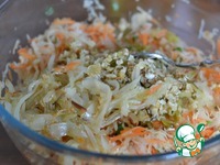 Орехи измельчить. огурцы натереть на терке для корейской моркови. К капусте добавить остывший жареный лук. орехи и огурцы. Все перемешать и оставить в холодильнике настояться на 4-5 часов. |