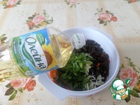Нарезанные овощи, морскую капусту и зелень выкладываем в чашку. Добавляем наршараб и растительное масло "Олейна". Перемешиваем. |