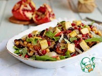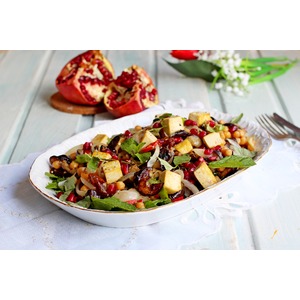 На большое блюдо выложить рукколу с медовой заправкой, поверх нут и овощи, и украсить тофу и зернами граната. Также очень хорошо сверху выложить пару листиков мяты. Приятного аппетита!! |