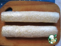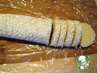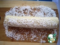 На доску ровным слоем насыпаем кокосовую стружку и обваливаем в ней каждую "колбаску" из теста, слегка прижимая стружку. |