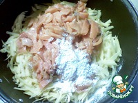 Нарезать сёмгу небольшими кусочками, выложить в миску к картофелю, добавить крахмал, соль и перец. |