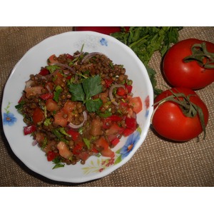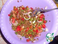 Отварную чечевицу остудить, добавить подготовленные овощи, зелень. Полить заправкой и перемешать. |