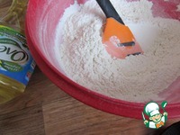 Этим временем просеять муку, добавить разрыхлитель теста и соль. Всё хорошо перемешать. |
