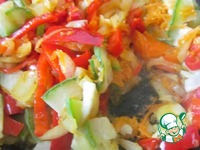 4. Для постной начинки обжарить лук, морковь, кабачок, красный болгарский перец, зелень. |