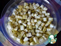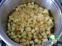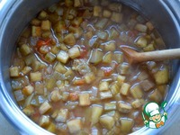 Переложить обжаренный лук в кастрюлю, где будем варить суп. Баклажаны промыть от соли и переложить в кастрюлю с луком. Перемешать. |