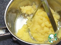 Отвар весь не выливать, часть отлить в чашку. Картофель подсушить, немного размять, добавить 1 ст. л. картофельного отвара, размять в более однородное пюре. |