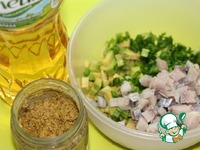 Зеленый лук мелко порезать. Смешать сельдь, авокадо и зеленый лук. Подсолнечное масло Олейна смешать с горчицей. |