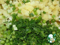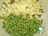 Замороженный зеленый горошек отварить в небольшом количестве соленой воды. Такой горошек нежнее и слаще, чем консервированный. |