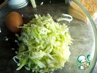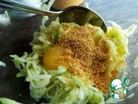 Отжать мякоть и слить жидкость. Добавить половину яйца, сухари и немного посолить. Перемешать. |