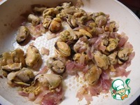 К луку добавить предварительно размороженные мидии, обжарить 5-6 минут, остудить. |