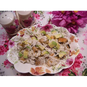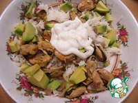 Смешать рис, авокадо, лук и мидии. |