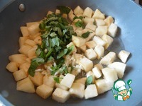 Сельдерей нарезать небольшими кубиками, обжарить на растительном масле ТМ "Олейна" 3-4 минуты. Закрыть крышкой, тушить еще 7-8 минут. |